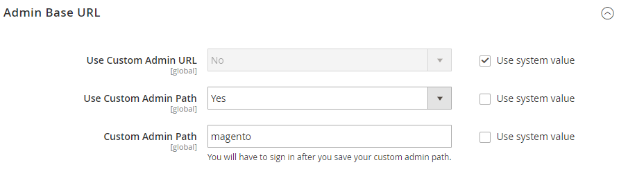 Da qui, occorre selezionare la sezione Admin Base URL. Seleziona “Yes” dalla sezione “Custom Admin Path” e inserisci il percorso di admin di tua scelta nella sezione “Custom Admin Path“.