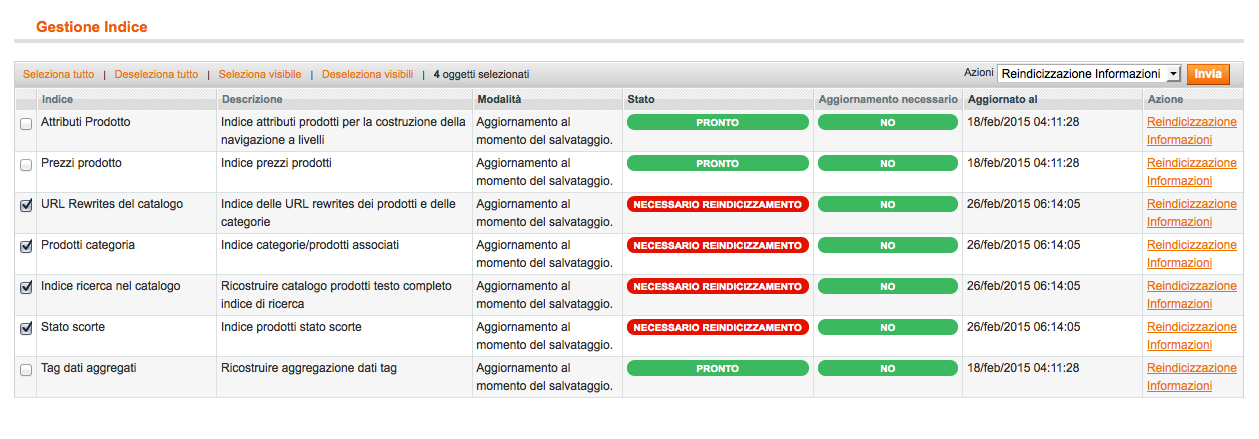 - Nella seguente schermata seleziona gli indici che hanno lo stato rosso (necessario reindicizzamento).
