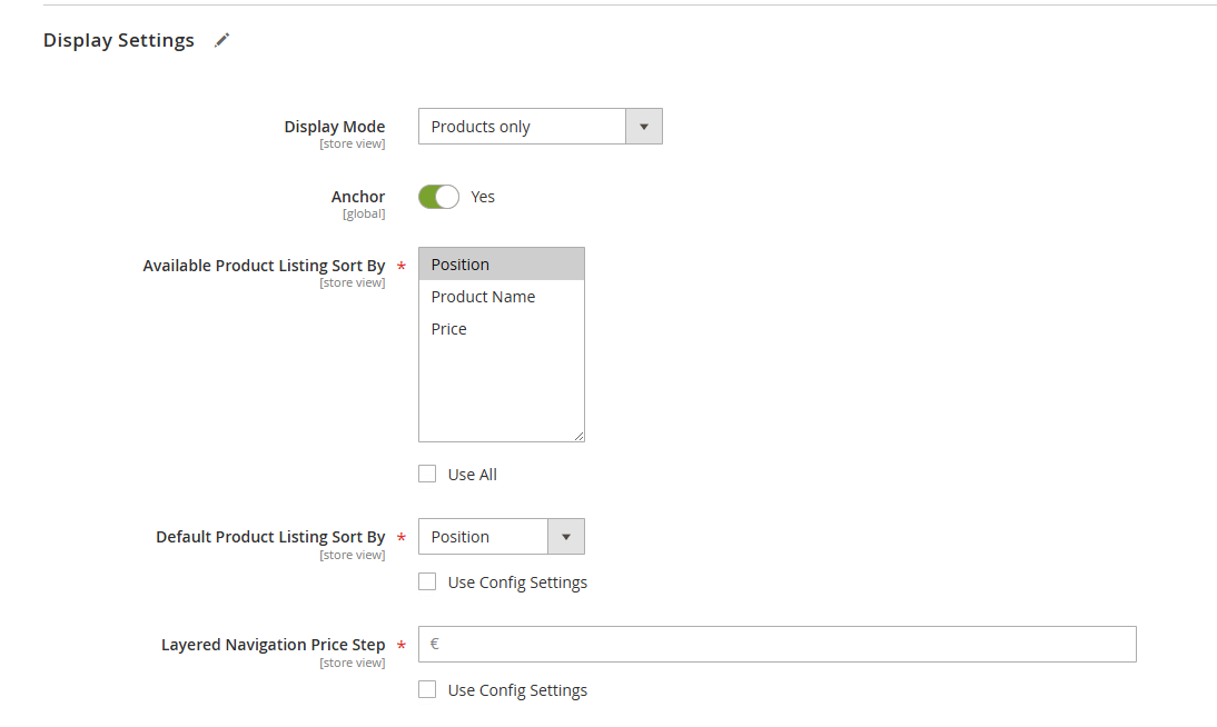 • Ora espandi la sezione Display Setting -> vai su Available Product Listing Sort By e aggiungi le opzioni di ordinamento desiderate nel campo. Ricordati di selezionare Position.