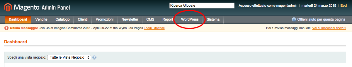 • Una volta fatto, questo chiudi e riapri nuovamente il tuo Admin di Magento. Potrai vedere che nel menù è comparsa una nuova voce chiamata WordPress.