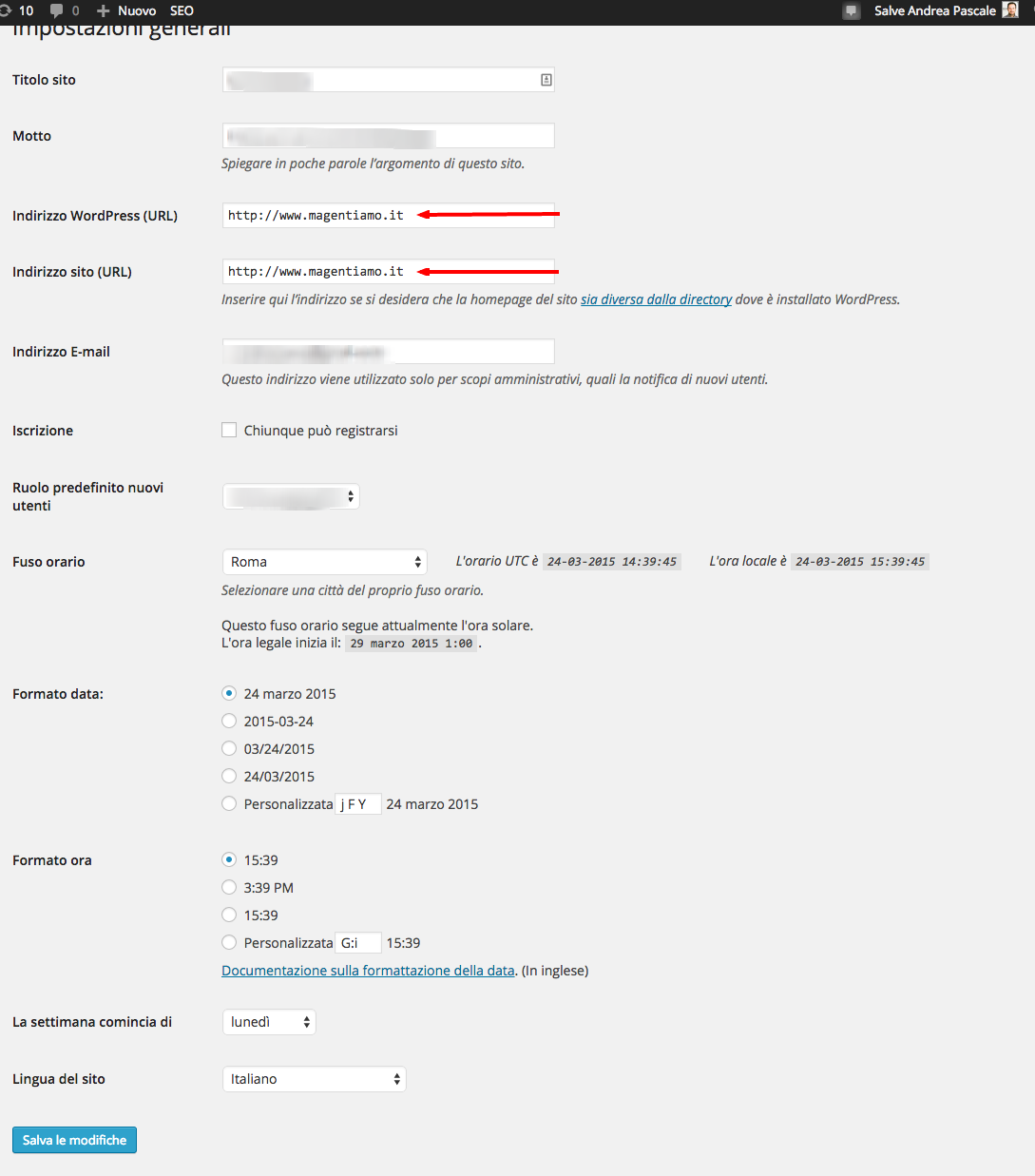In questa schermata puoi modificare varie impostazioni generali del tuo blog. La cosa importante su cui ti devi focalizzare è che gli indirizzi WordPress e del sito siano gli stessi di quelli usati in precedenza.