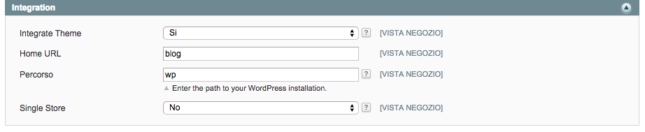 • Nell’Indirizzo di WordPress devi inserire lo stesso che hai inserito nell’Admin di Magento, esattamente nella sezione “miscellaneus”, nel campo percorso WordPress”.
