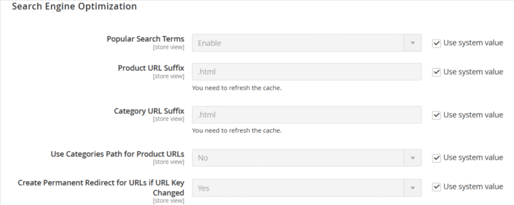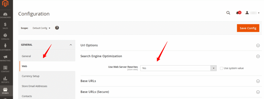 - Vai su Stores -> Configuration -> Catalog -> Search Engine Optimization.