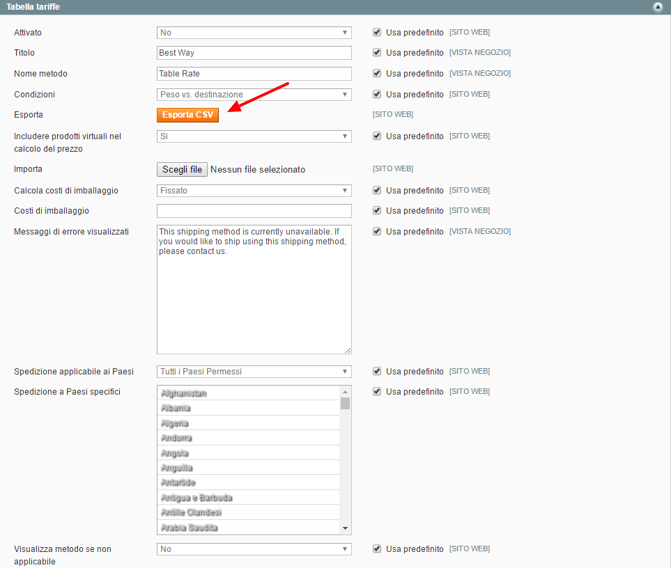• Cliccare su Esporta CSV e salvare la tablerates.csv sul computer.
