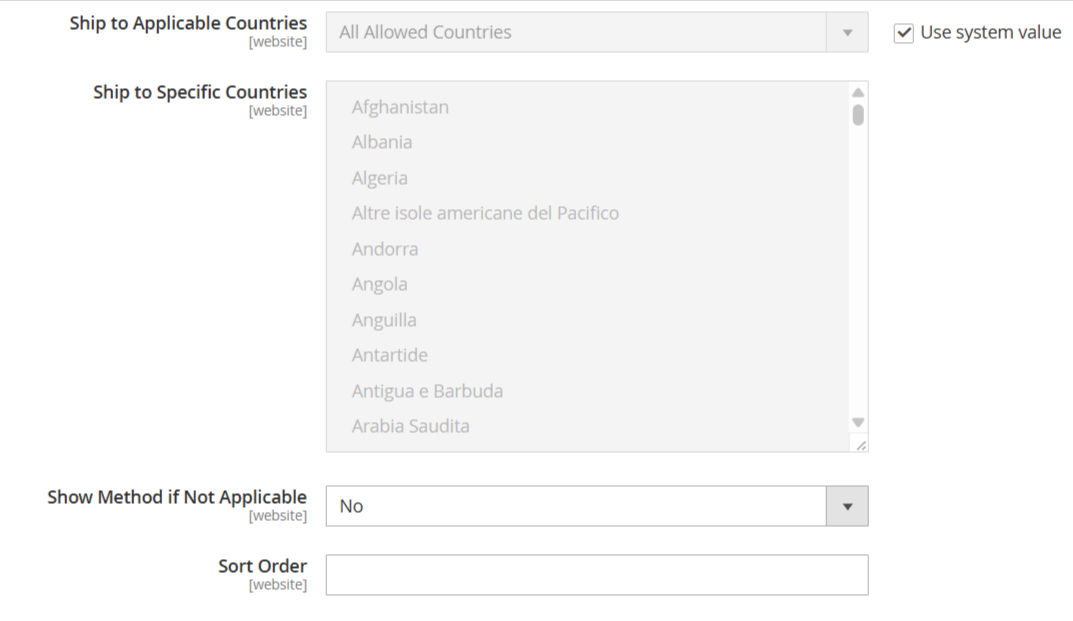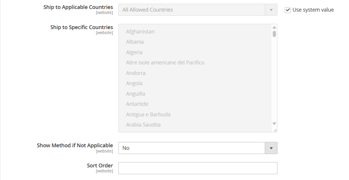 • In Sort Order, inserisci un numero per definire la posizione del metodo nell’elenco delle opzioni di spedizione al checkout (es. 0 = prima, 1 = seconda, 2 = terza).