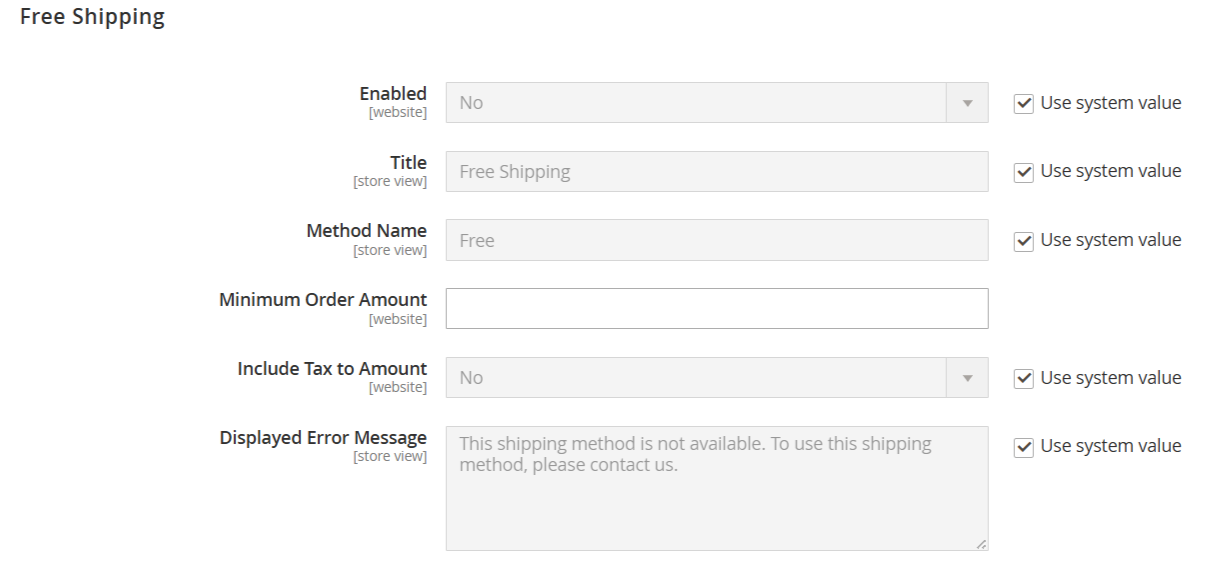 • In Displayed Error Message, scrivi il messaggio che verrà mostrato se la spedizione gratuita non è disponibile per un determinato ordine.