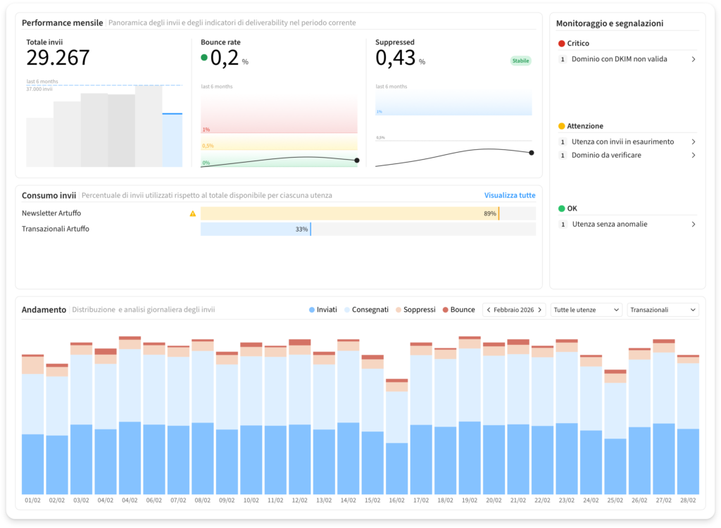 Una gestione strutturata degli invii consente di mantenere continuità nei flussi automatici anche in presenza di volumi variabili, riducendo la complessità operativa e migliorando l’affidabilità del servizio.