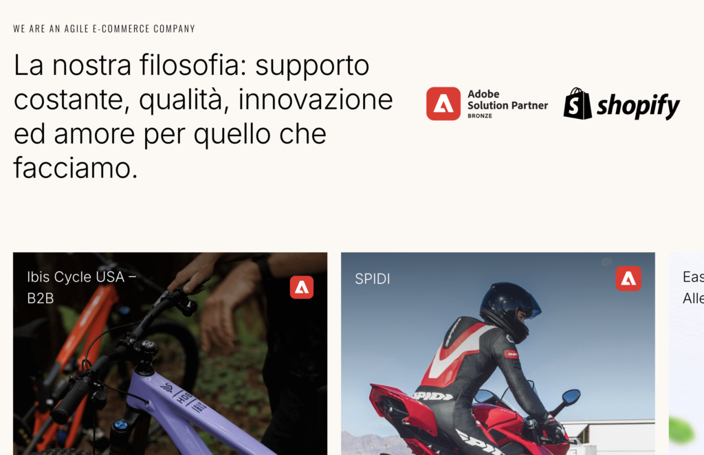 commerce basati su Adobe Commerce Cloud, Magento Open, Hyva e Shopify Pluse Akeneo; inoltre è Adobe Solution Partner e Shopify Partner.