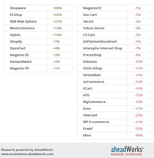 Al contrario, altre piattaforme come ad esempio PrestaShop, VirtueMart, ZenCart, hanno ceduto parte della loro percentuale di mercato ai concorrenti.