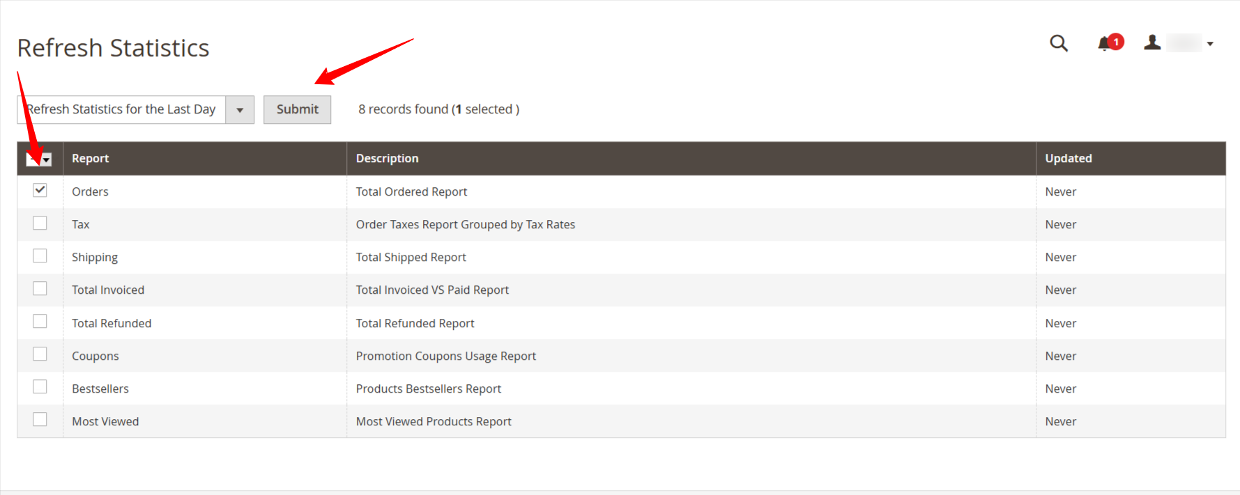 - Vai su Report – > Statistics – > Refresh Statistics e seleziona i report che desideri aggiornare.